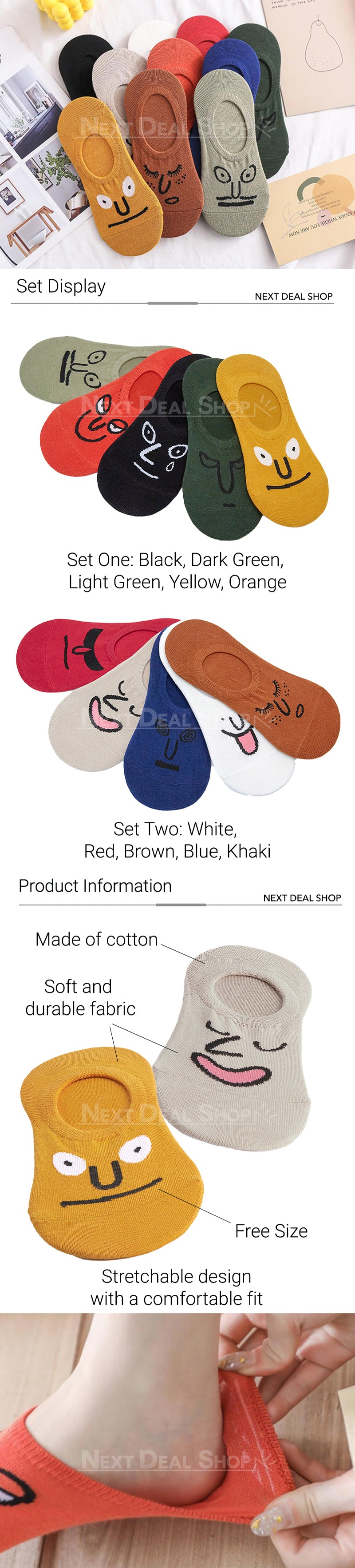 | Package Components | 5 Pairs x Funny Expression Socks Set One: Black, Dark Green, Light Green, Yellow, Orange Set Two: White, Red, Brown, Blue, Khaki |