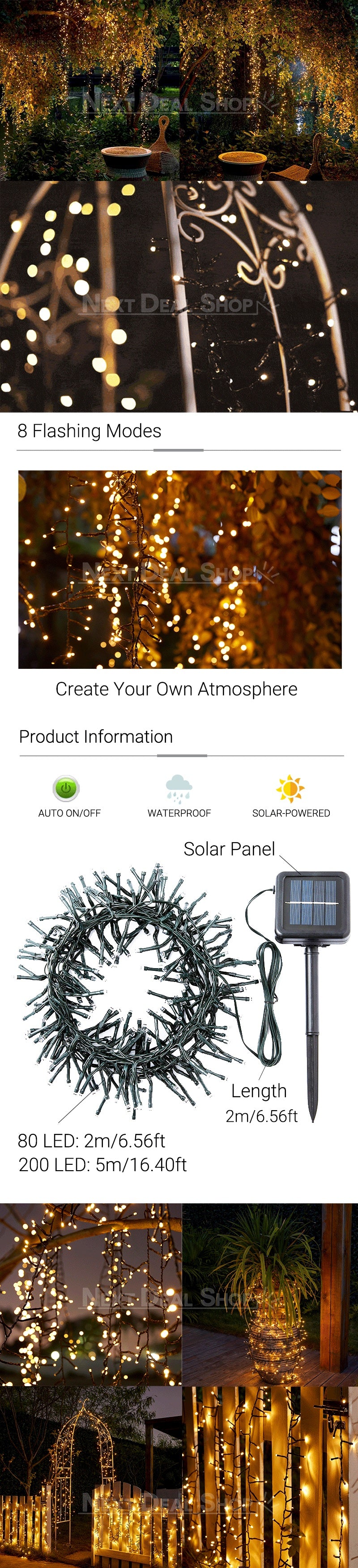 80 LED: Lead from Solar Panel to First Lights: 2m/6.56ft Length of Light String: 2m/6.56ft Total Length: 4m/13.12ft 200 LED: Lead from Solar Panel to First Lights: 2m/6.56ft Length of Light String: 5m/16.40ft Total Length: 7m/22.96ft |